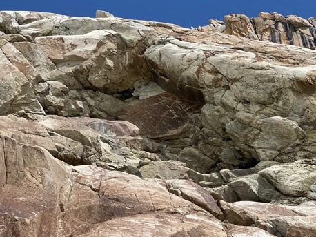 Ausgerüstet mit Meissel und Strahlerstock begeben wir uns auf eine Wanderung zu den Fundstellen und Klüften. Durch Unterstützung der Strahler finden wir hier kleine Kristallspitzen in den alten Klüften und an den Quarzadern im Fels.