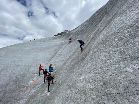 Du machst dich mit der Gletscherausrüstung vertraut, lernst Steigeisentechniken und Pickeltechniken und weisst wie man sich auf Firnfelder oder auf Gletscher Verhalten soll.