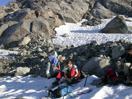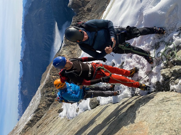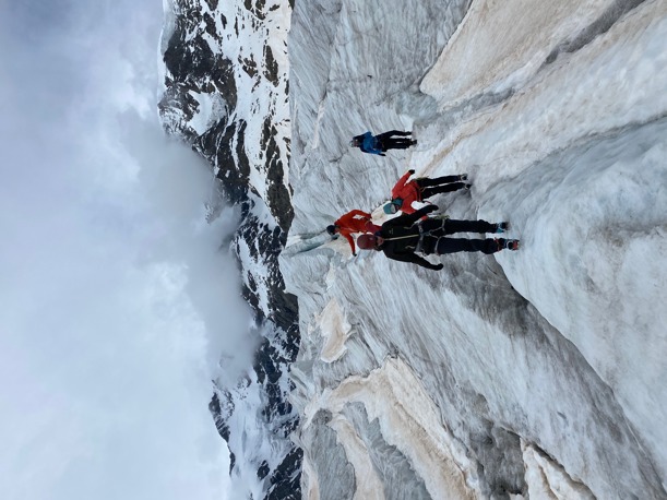 Mittwoch: Eisausbildung auf dem Morteratschgletscher: Gehen mit Steigeisen, Umgang mit Pickel, Eisklettern und Gehen am Seil, Verankerungen und Spaltenrettung
