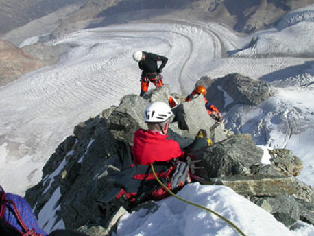 Vom richtigen Gehen im weglosem Gelände, Seil- und Sicherungstechniken, Klettertechnik im Fels und Eis. Mit Steigeisen im Firn und über Gräte sicher zu gehen.