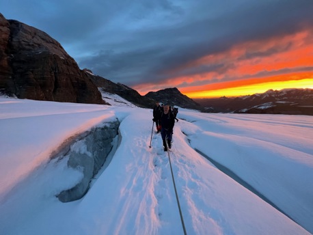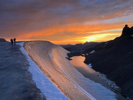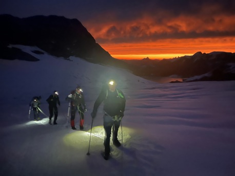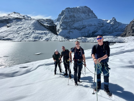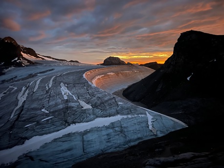 Die saftigen, grünen Wiesen lassen wir bald unter uns und wandern stetig höher bis zum legendären Iswändli. Ganz früher eine richtige Eiswand, ist diese heute nur noch ein geneigter Hang und mit Steigeisen leicht zu begehen. Bald erblicken wir den Gipfel des Clariden. Doch vorher überschreiten wir noch den Vorgipfel und kraxeln über den kurzen Felsgrat, der mit Ketten ausgerüstet ist, zum höchsten Punkt. Bei guter Fernsicht können Sie einige Viertausender der Berner und Walliser Alpen sehen. Nach einer zünftigen Gipfelrast, steigen wir auf Firn und Schnee zum Claridengletscher ab. Auf diesem und über den vergletscherten Claridenpass erreichen wir bald die, von mächtigen Gletschern umgebene, Planurahütte. Eine wahrlich schmucke Oase in dieser Hochgebirgswelt.