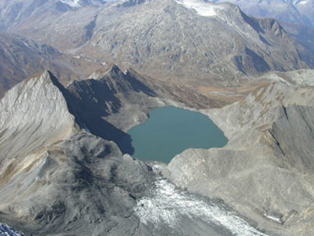 Schwarzer Fels, hartes Eis und das Blau des Gletschersees am Fuss des Piz Terri. Der Berg ist aus scharzem Bündner Schiefer gebildet, der rasch verwittert und damit grosseSchutthänge am Bergfuss zurücklässt. Pater Placidus a Spescha gelang die Erstbesteigung und Solo-Erkletterung des Piz Terri mit Lederschuhen, Hanfstrick, selbstgebastelten Steigeisen. Weil Angst und Schwindel seinen Begleiter befiel, musste er die letzten, ausgesetzten Meter zum Gipfel alleine zurücklegen...