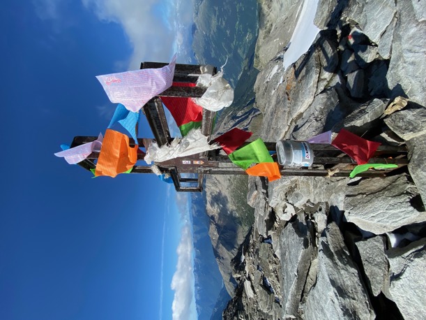 Die Aussicht vom Gipfel reicht im Westen bis zu Monte Rosa und Montblanc und im Osten bis zum Ortler und Cevedale..